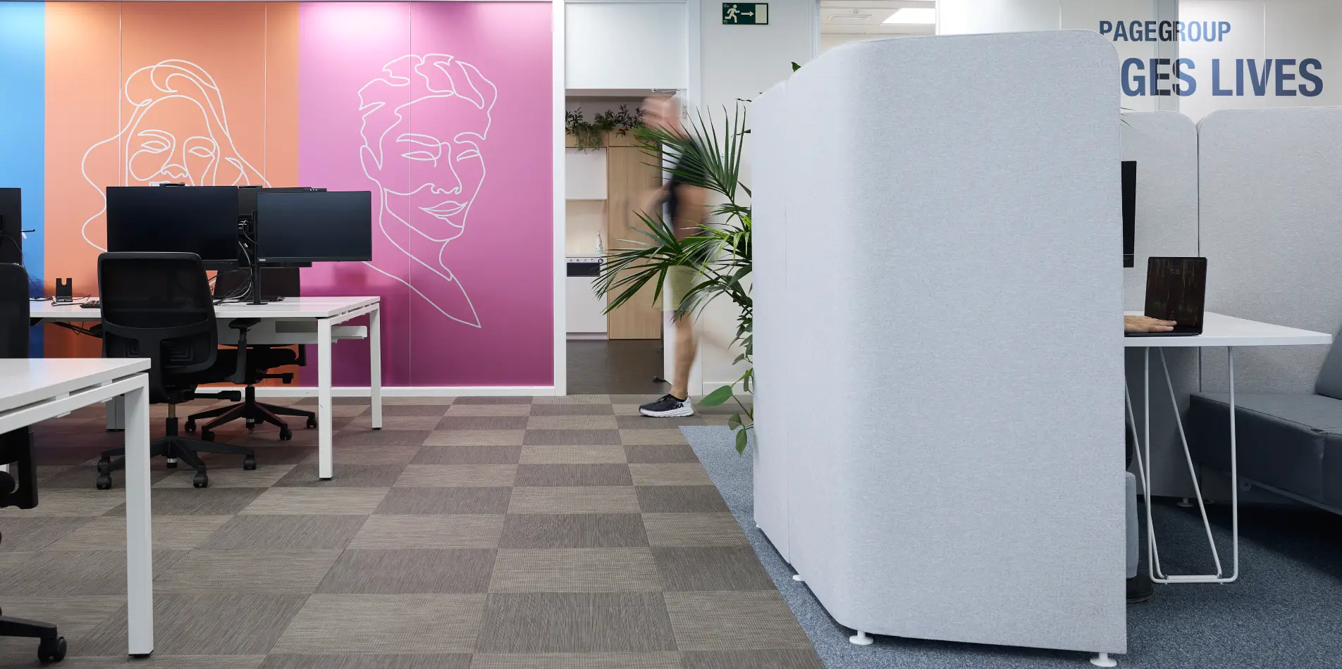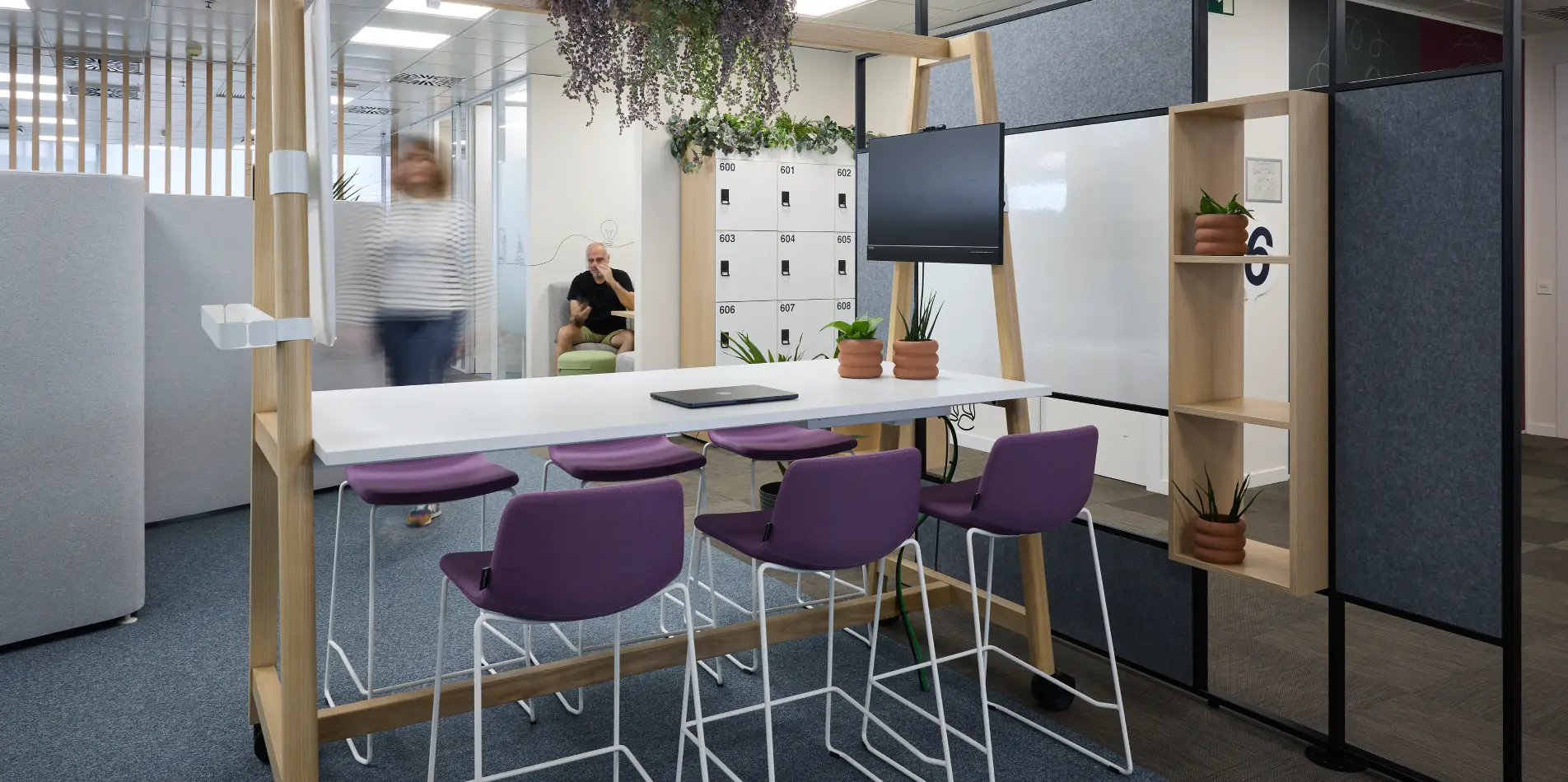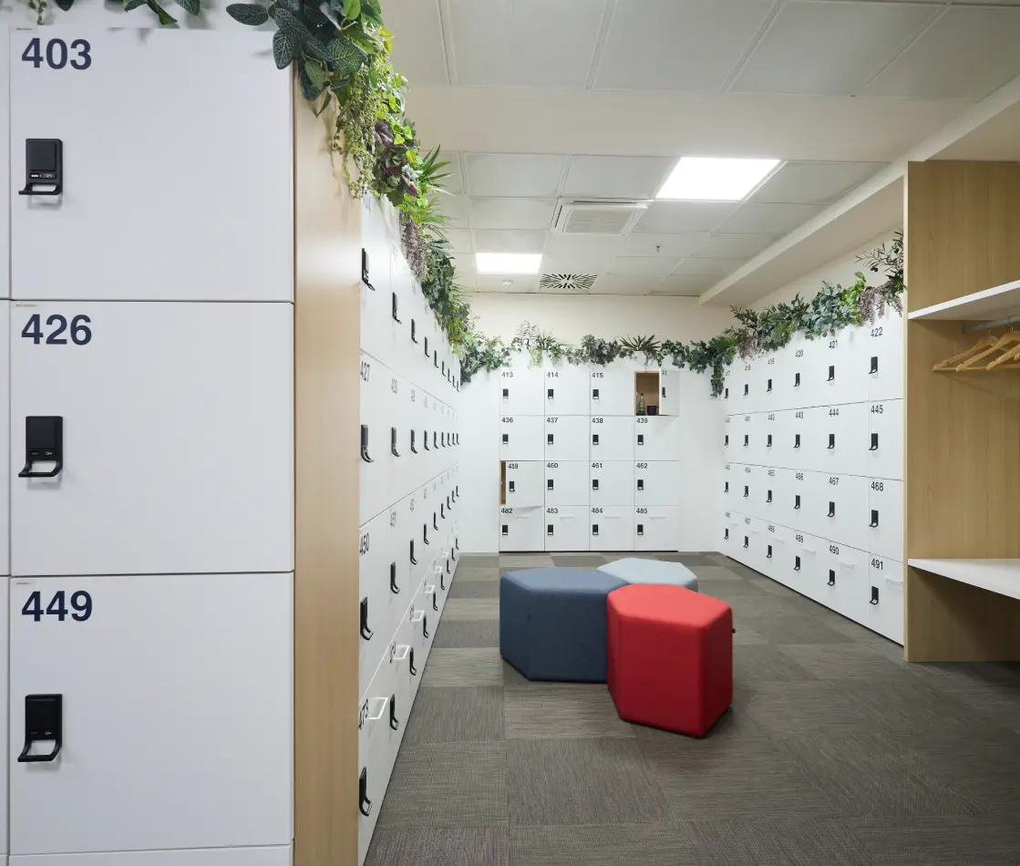 Se desarrolla un proyecto de estudio de ocupación por plantas teniendo en cuenta el “hotdesking” de cada departamento para poder trabajar varias propuestas de distribución y conseguir que entre un 20-30% de la superficie de la planta esté dedicada a zonas de valor añadido: espacios polivalentes, áreas de descanso, zonas de reuniones informal y zonas de relax. Además de esto, se lleva a cabo una gran implantación de taquillas personales para implementar la operatividad completa de cada departamento.